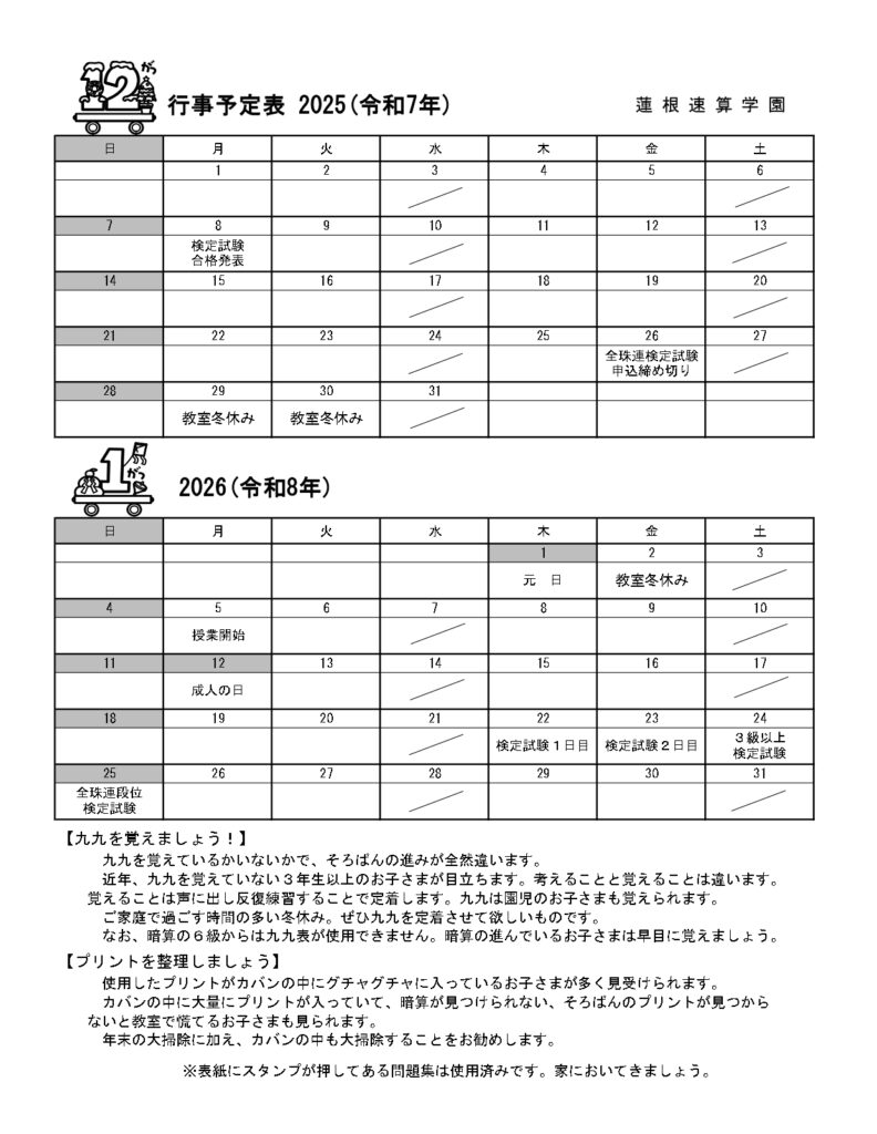 2025年12月・2026年1月の予定表を掲載いたしました。